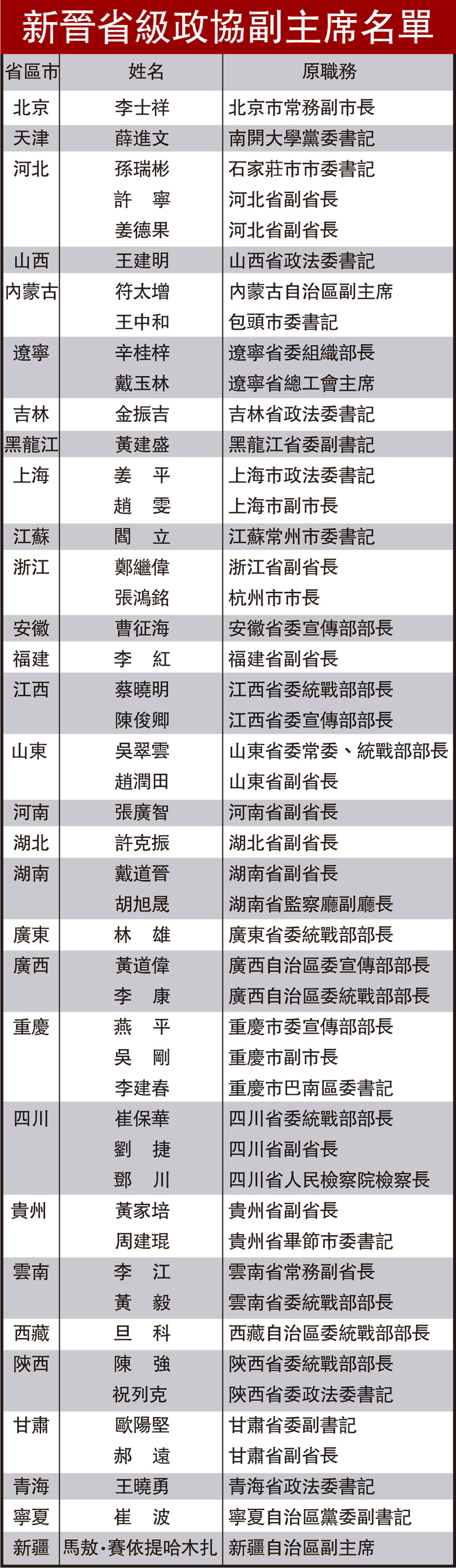 新晉省級政協副主席名單