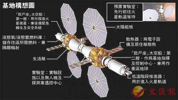 基地由兩個「獵戶座」太空船組成,最多可讓6名太空人居住,他們會進行實時科學探測、分析火星岩石及土壤樣本,以及選定太空人登陸火星的理想地點。