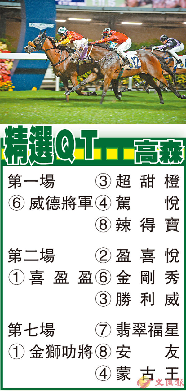第二場、第五班、一二○○米。「喜盈盈」(圖前駒)月初試谷草千二米閘,沿途居內欄中間位,扣韁下走來已見搶韁欲馳,入直路鞍上人輕打一鞭,馬兒即從兩駒之間空位竄上,狀態已見不俗,再經打磨至今配合落班優勢,可作出反彈。「金剛秀」經過適應水土環境後,今季終踏上正軌,前仗同程影相僅敗後,縮爭一千米便順利贏馬補中,相信可繼續搖扶直上。