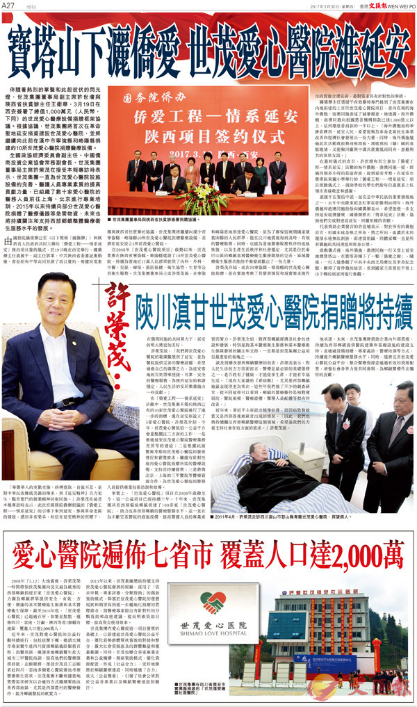 由國務院僑務辦公室(以下簡稱「國僑辦」)和陝西省人民政府共同主辦的「僑愛工程--情系延安」陝西項目簽約儀式,於19日晚在西安舉行。國僑辦主任裘援平、副主任郭軍,中共陝西省委書記婁勤儉、省長胡和平等共同見證了項目簽約。根據世茂集團與陝西省扶貧辦的協議,世茂集團將繼續向漢中市寧強縣、略陽縣10所世茂愛心醫院捐贈醫療設備,並將在延安設立5所世茂愛心醫院。