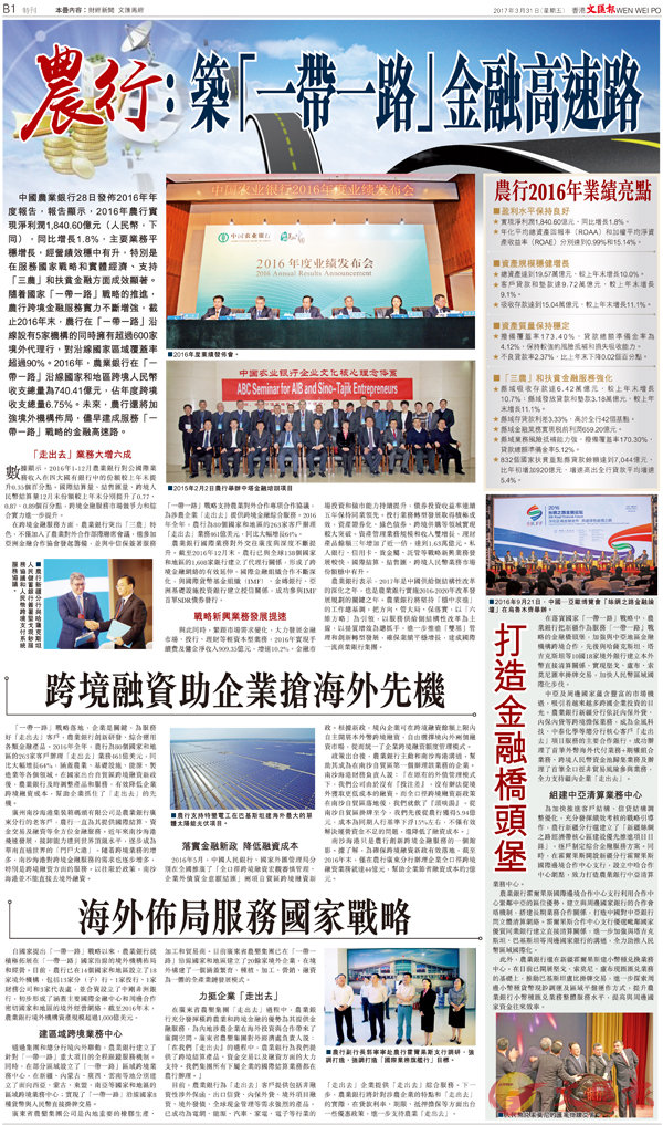 中國農業銀行28日發佈2016年年度報告,報告顯示,2016年農行實現淨利潤1,840.60億元(人民幣,下同),同比增長1.8%,主要業務平穩增長,經營績效穩中有升,特別是在服務國家戰略和實體經濟、支持「三農」和扶貧金融方面成效顯著。隨著國家「一帶一路」戰略的推進,農行跨境金融服務實力不斷增強,截止2016年末,農行在「一帶一路」沿線設有5家機構的同時擁有超過600家境外代理行,對沿線國家區域覆蓋率超過90%。2016年,農業銀行在「一帶一路」沿線國家和地區跨境人民幣收支總量為740.41億元,占年度跨境收支總量6.75%。未來,農行還將加強境外機構佈局,盡早建成服務「一帶一路」戰略的金融高速路。