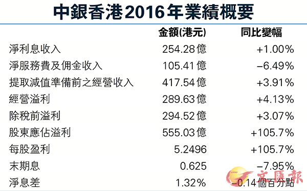 中銀香港2016年業績概要