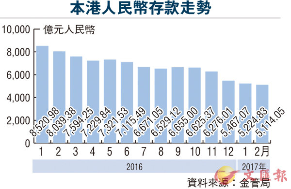 香港文匯報訊 受人民幣貶值憂慮拖累,本港人民幣存款連續5個月下跌。金管局昨發表的數字顯示,最新2月份的本港人民幣存款減少2.1%,惟較1月的4.4%按月跌幅收窄。至2月底的約5,114億元,減少110.78億元人民幣。跨境貿易結算的人民幣匯款總額於2月份為2,383億元人民幣,按月減少327億元人民幣。金管局公告指,本港3月份人民幣存款保持穩定。