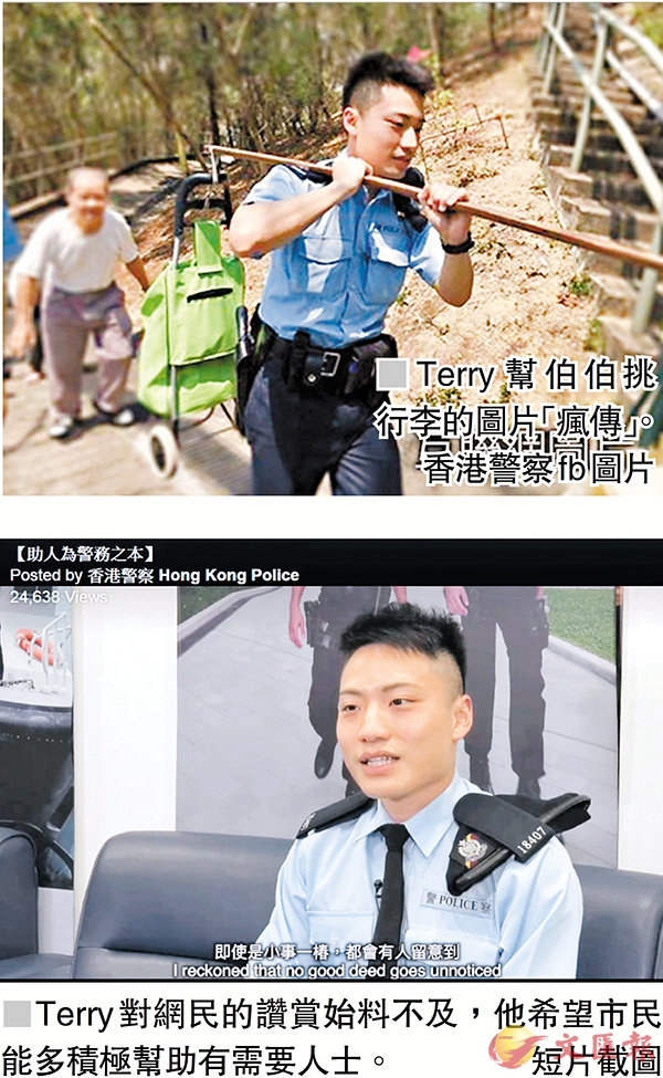 一名警員日前為長者挑行李上山,照片更被網友上載至社交網站facebook,不少網民紛紛讚揚該名警員熱心行善。香港警察fb專頁前天便上載一段短片,邀得當事人--駐守機動部隊的Terry講述當日情況。