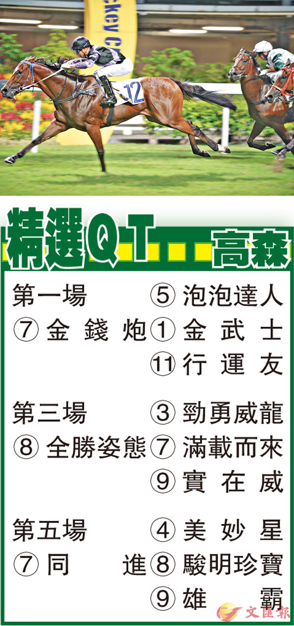 第一場、第五班、一○○○米。「金錢炮」近三戰全攻田草千四米,俱擺前走以中等步速放得兩席季軍,今次縮程兼轉攻窄場,提防在此且戰且走帶到。「金武士」自從在五班谷中千二米得第二W後,升回四班都經常交出接近表現,論態尚未回落,而今輾轉又降回五班列陣,形勢又變得有利,值得重視。