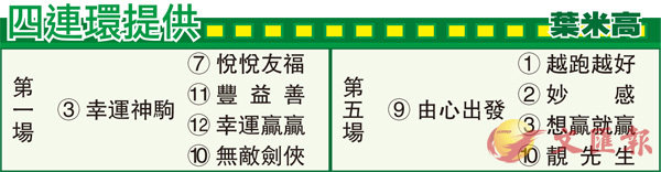 第一場、第五班、二二○○米。「幸運」系馬匹掌舵人梁啟徽,最具成就當然係養過一匹馬王「幸運馬主」,佢近季一直主打引入愛駒配種後所生子嗣來港,可惜此駒鬗@四年因病離世,所以佢同囝囝名下「幸運馬王」同「幸運神威」都可以講係「幸運馬主」最後一批運港子嗣。不過今次出爭五班二千二百米「幸運神駒」,雖然並唔係出自「幸運馬主」,其實以同系馬在港令人失望表現,幕後嘗試不同貨源力求突破絕對合理。「幸運神駒」係偏向慢熱麊瓥~馬,初期無表現屬幕後意料之內,果然落到五班三場得一季一第五,今次出戰長途賽事出擊心意昭然,有望為馬主破悶局。