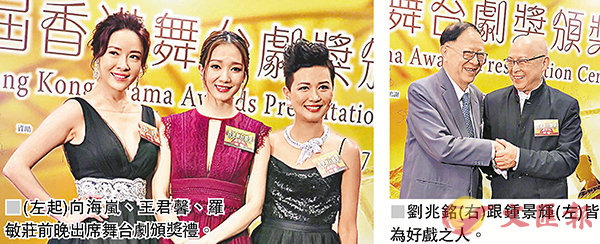 香港文匯報訊(記者 李慶全)「第26屆香港舞台劇獎」頒獎禮前晚假香港大會堂舉行,戲劇大師鍾景輝(King Sir)、資深舞台劇演員劉兆銘、粵劇老倌李龍、演員葉童、王君馨、向海嵐及白只均有出席;羅敏莊(Mimi)則以嘉賓身份表演歌舞。最終香港話劇團的《親愛的.胡雪巖》榮膺最佳整體演出獎,悲劇/正劇和喜劇/鬧劇的最佳男主角分別是潘燦良和宋本浩,至於這兩個組別的最佳女主角則分別是羅冠蘭和邵美君。