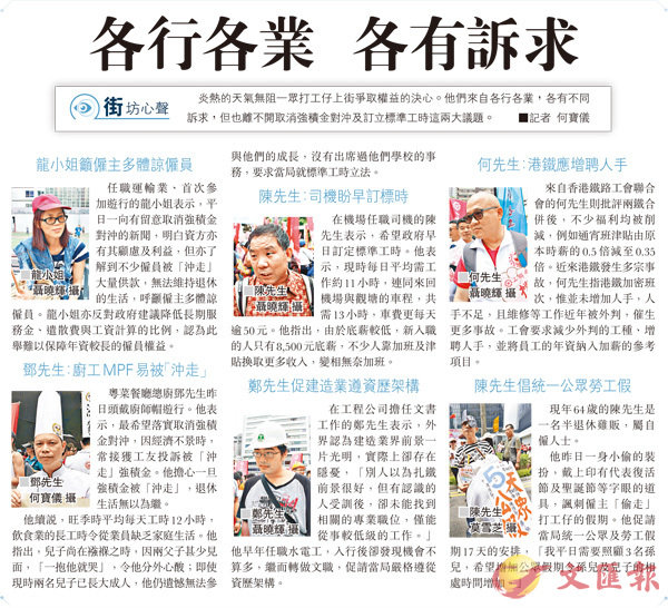 炎熱的天氣無阻一眾打工仔上街爭取權益的決心。他們來自各行各業,各有不同訴求,但也離不開取消強積金對沖及訂立標準工時這兩大議題。 ■記者 何寶儀