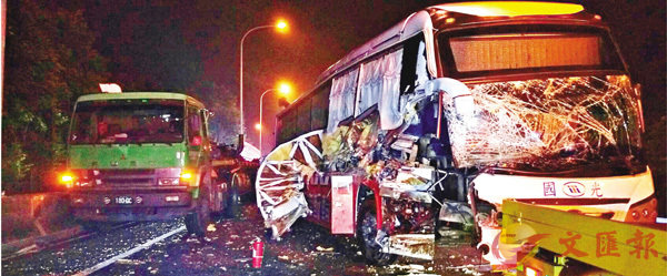 昨日凌晨,一輛拖板車行經「國道1號」南下路段,車上帆布掉落,停在苗栗匝道口準備整理時,遭後方國光客運車輛追撞,導致12人遭受輕重傷,就醫後都沒有生命危險。 ■圖/文:中央社