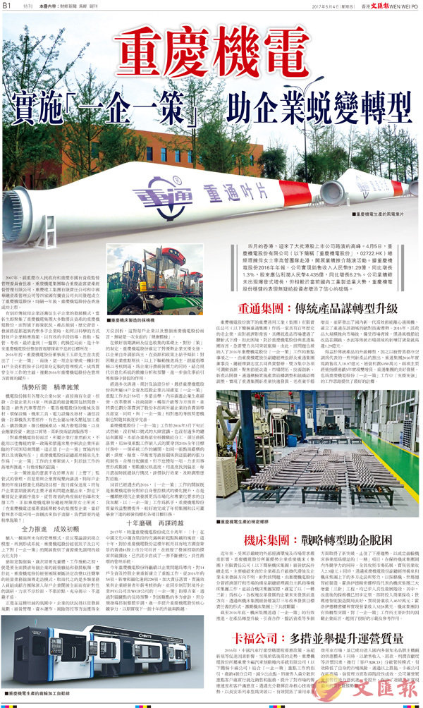 今年重慶機電股份將繼續以企業問題為導向,對14戶全資及控股企業重新確立了重點工作,從2016年的58項,新增和細化達到228項,加大責任落實,實施效果與企業經營者年薪考核掛u,並同步制訂對境外企業PTG公司及WGP公司的「一企一策」指導方案。通過對關鍵點的及時預警,對困難點的多方會診,用分類指導控制整體步調,進一步提升重慶機電股份核心競爭力,以期實現下一個十年的升級與跨越。