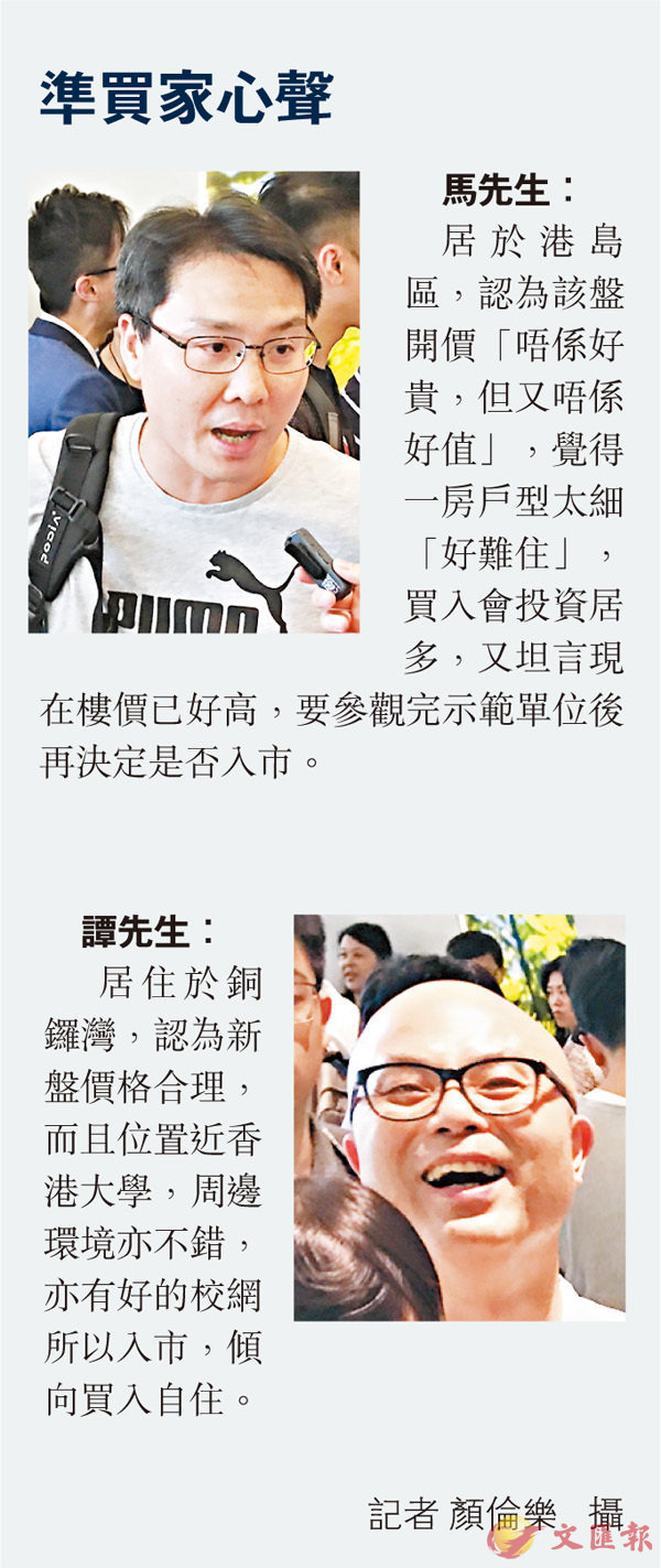 馬先生:居於港島區,認為該盤開價「唔係好貴,但又唔係好值」,覺得一房戶型太細「好難住」,買入會投資居多,又坦言現在樓價已好高,要參觀完示範單位後再決定是否入市。