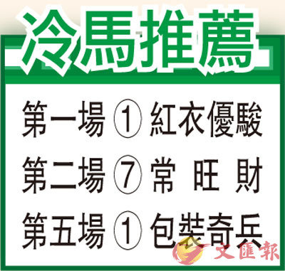 第一場、第四班、一○○○米。「紅衣優駿」在新西蘭只上陣兩次里程尚新,雖然只贏過一場千一米處女馬賽,惟該賽亞軍之後已取得四場頭馬,估計「紅衣優駿」在港長線有力在三班賽爭勝,此駒來港之後已五度上陣雖然未曾入三甲,但可視為減分計劃,並不反映真正實力,試準後今賽再揀四班谷草上陣實屬目標所在,同場有大樹遮蔭分頭必佳下更有值博率。