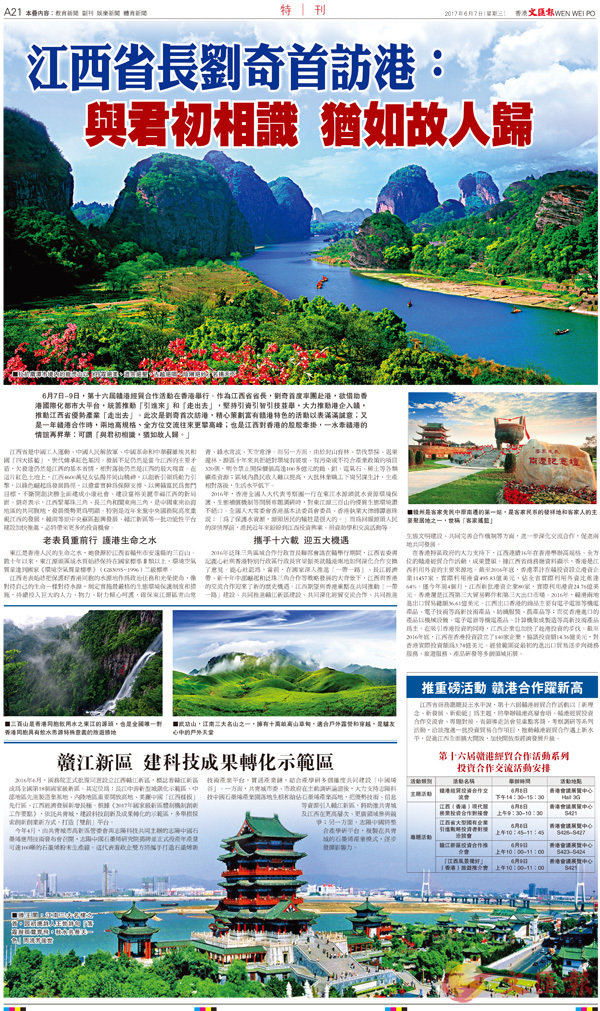 6月7日-9日,第十六屆贛港經貿合作活動在香港舉行。作為江西省省長,劉奇首度率團赴港,欲借助香港國際化都市大平台,統籌推動「引進來」和「走出去」,堅持引資引智引技並舉,大力推動港企入贛,推動江西省優勢產業「走出去」。此次是劉奇首次訪港,精心策劃富有贛港特色的活動以表滿滿誠意;又是一年贛港合作時,兩地高規格、全方位交流往來更攀高峰;也是江西對香港的殷殷牽掛,一水牽贛港的情誼再昇華:可謂「與君初相識,猶如故人歸。」