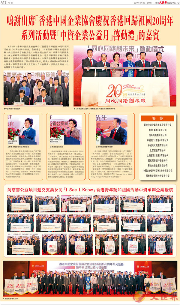 6月1日,香港中國企業協會舉行「慶香港回歸祖國20周年系列活動暨『中資企業公益月』啟動禮」,為系列慶回歸活動揭開序幕。候任行政長官林鄭月娥、中聯辦副主任仇鴻、政務司司長張建宗、解放軍駐港部隊副政治委員蔡永中、外交部駐港特派員公署參贊徐永、香港中國企業協會名譽會長、中國旅遊集團董事長張學武擔任主禮嘉賓並啟動「同心同路創未來」標識。盛典逾400位政商名人雲集,多位港區全國人大代表、立法會議員,以及各大商會,社會團體首長亦有出席。