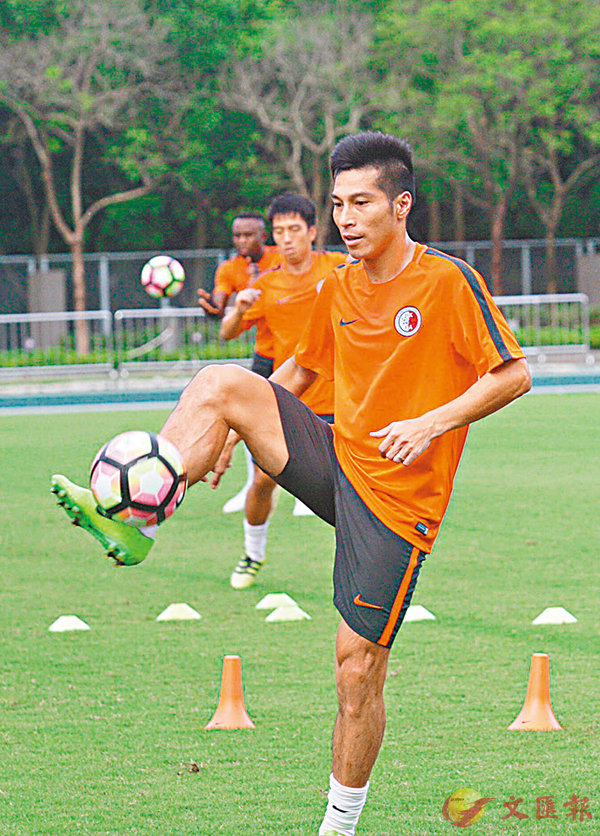 ■為家庭從中甲回流的李志豪(右),在周三對約旦一役創下代表港隊上陣A級賽69場的新紀錄。港足昨復課,他笑言希望可以踢到100場,但更望下周二亞洲盃小組賽主場可以贏朝鮮。