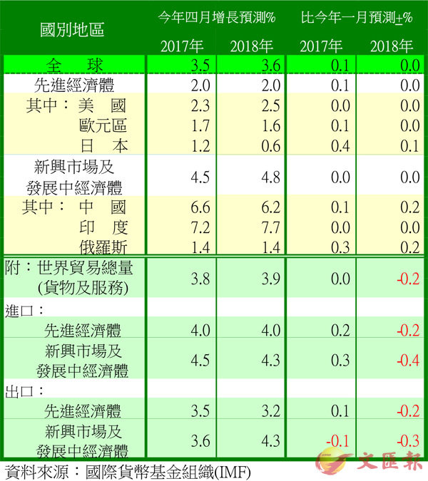 與今年一月份預測相比,今年整體增長率為3.5%,微升0.1%,其中先進經濟體由1.9%調升為2%,主要是歐元區、日本分別上調0.1%、0.4%,美國2.3%不變;新興市場及發展中經濟體持續4.5%無變,但其中中國和俄羅斯分別上調0.1%及0.3%。