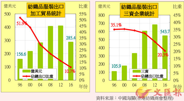 據中國海關統計,2016年內地紡織品及服裝(下簡稱紡衣)出口總額中,屬於加工貿易方式出口的只為285.4億美元,較上年續減17.6%,遠較紡衣整體出口的減幅(5.9%)為大。如與2011年最多時550.85億美元相比更減48.2%即減近一半。加工貿易在總出口中所佔比重由上年12.1%再縮小至10.7%即僅約一成。與1996年最高時佔51.9%相比,已跌逾四成(詳附圖一)。