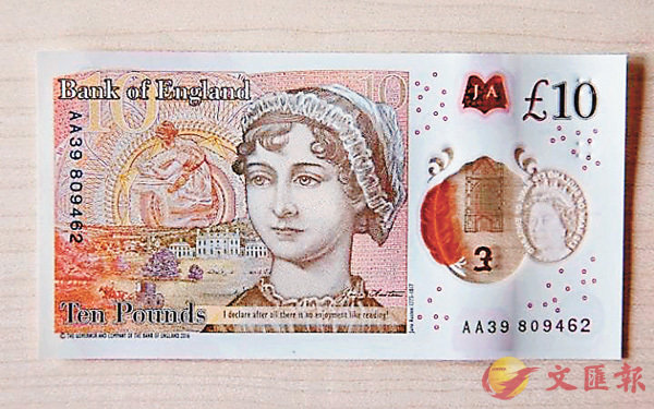 英倫銀行昨日公佈首款10英鎊膠鈔,鈔票印上19世紀英國著名小說家珍奧斯汀的肖像,將於9月14日正式推出。昨日是珍奧斯汀逝世200周年,英倫銀行行長卡尼在發鈔儀式前,讚揚珍奧斯汀在全球影響力歷久不衰。