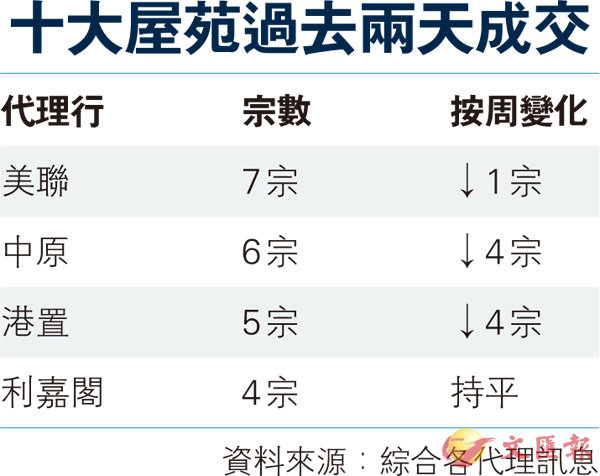 中原地產十大屋苑於過去兩天錄得6宗成交,較上周10宗急跌4成,當中鴨c洲海怡半島、荔枝角美孚新h、藍田麗港城及天水圍嘉湖山莊各錄1宗成交,映灣園則錄兩宗成交。中原地產亞太區副主席兼住宅部總裁陳永傑表示,過去周末市場繼續有新盤銷售,吸走部分市場購買力,而昨早八號風球突然來襲,市民紛紛取消睇樓,導致成交量減少。