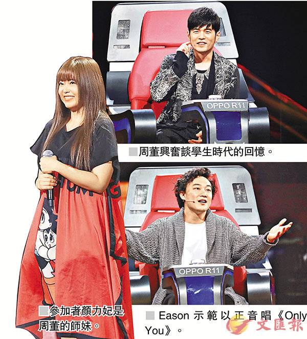曾在淡水中學讀書的顏力妃更在台上跟學長周董相認,自稱念舊的周董就從「你住哪兒?」、「當年你是留宿還是通車回校?」作話題開端,開始跟學妹大談學生時代的回憶。周董更自爆當年上學時故意在琴房大聲彈琴,想吸引女生的注意。二人又講起周董曾回母校拍MV,深受學妺歡迎,學妹顏力妃更大爆由於學妹太崇拜周董,因此在學校擺放的周董大頭照、生活照、團體照等,他的頭都會被剪走,二人有講有笑,其他導師想插嘴都不行。
