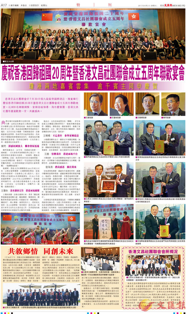 香港文昌社團聯會於7月30日假九龍龍堡國際酒店,隆重舉行慶祝香港回歸祖國20周年暨香港文昌社團聯會成立五周年聯歡晚宴。近800名鄉親鄉賢、家鄉各級領導、海外慶賀團、香港兄弟社團等嘉賓歡聚一堂,共襄盛典。