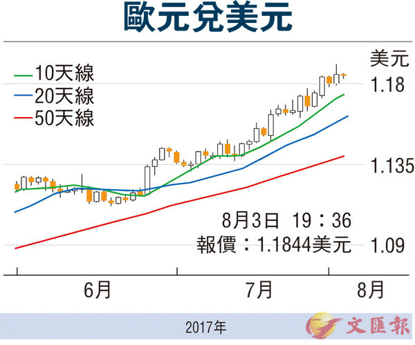 美元指數周三曾跌至2016年5月以來最低點92.55,儘管第二季美國企業盈利呈雙位數增長,且上月民間部門就業人口又新增17.8萬人,但有關美聯儲第三次加息的預期已淡化,期貨市場目前預計2017年底之前再次加息的可能性只有35%。美元下跌推動歐元走高,歐元兌美元周三觸及兩年半高位1.1910。歐元兌美元今年以來已累計漲逾12.5%,投資者當前將聚焦周五公佈的美國非農就業數據。