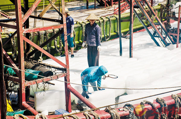 昨日,中國南海開捕在即,廣西北海漁民在碼頭加儲冰塊為開海捕撈做準備。北海市是廣西重要的漁業重鎮,現有數千艘漁船在港休漁。南海歷時兩個半月的「最嚴休漁期」即將於8月16日結束,開漁臨近,已有部分漁民開始「厲兵秣馬」,為南海開捕做準備。 ■圖/文:中新社