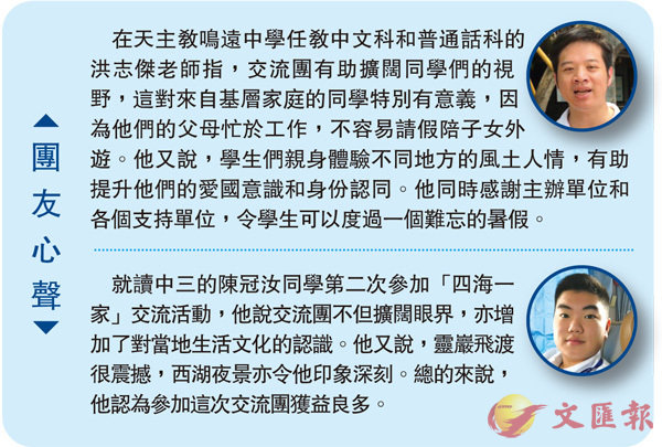 在天主教鳴遠中學任教中文科和普通話科的洪志傑老師指,交流團有助擴闊同學們的視野,這對來自基層家庭的同學特別有意義,因為他們的父母忙於工作,不容易請假陪子女外遊。他又說,學生們親身體驗不同地方的風土人情,有助提升他們的愛國意識和身份認同。他同時感謝主辦單位和各個支持單位,令學生可以度過一個難忘的暑假。