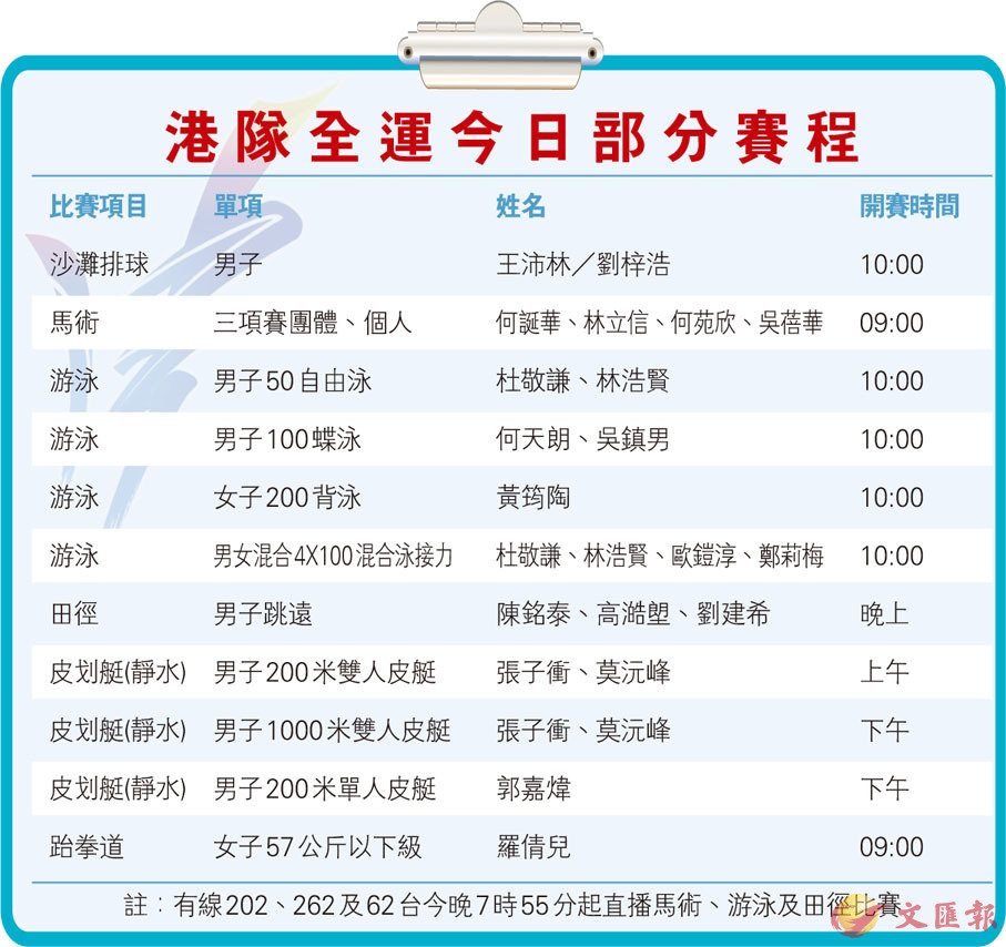 港隊全運今日部分賽程
