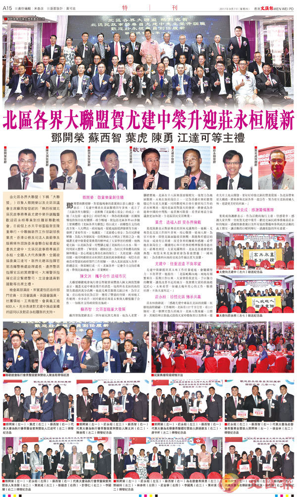 由北區各界大聯盟(下稱「大聯盟」)召集人鄧開榮以及北區區議會主席蘇西智發起的「熱烈祝賀北區民政事務專員尤建中榮升調職暨歡迎莊永桓專員到任履新聯歡晚會」日前假上水天平邨富臨皇宮隆重舉行。中聯辦新界工作部副部長葉虎,香港公務及司法人員薪俸及服務條件諮詢委員會聯合秘書處秘書長尤建中,北區民政事務專員莊永桓,全國人大代表陳勇,全國政協委員江達可,新界北總區指揮官郭浩輝警務處助理處長、邊界警區指揮官丘紹箕總警司、大埔警區指揮官莊定賢總警司,立法會議員劉國勳等出席主禮。