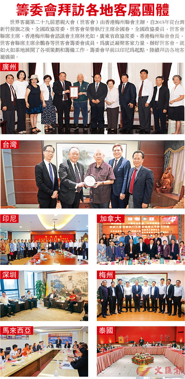 世界客屬第二十九屆懇親大會(世客會)由香港梅州聯會主辦,自2015年從台灣新竹接旗之後,全國政協常委、世客會榮譽執行主席余國春,全國政協委員、世客會聯席主席、香港梅州聯會諮議會主席林光如,廣東省政協常委、香港梅州聯會會長、世客會聯席主席余鵬春等世客會籌委會成員,為廣泛凝聚客家力量、辦好世客會,就如火如荼地展開了各項策劃和籌備工作。籌委會早前以印尼為起點,陸續拜訪各地客屬僑領。