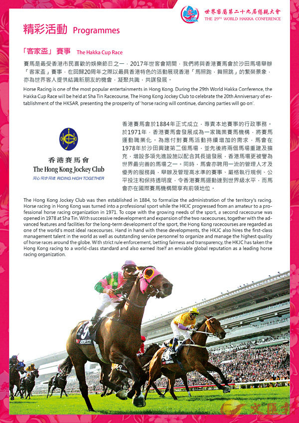 賽馬是香港特色、最受香港市民喜歡的娛樂活動之一。10月14日,「世客會」將與香港賽馬會於沙田馬場舉辦「客家盃」賽事,在回歸20周年之際以最具香港特色的活動展現香港「舞照跳、馬照跑」的繁榮與熱鬧,讓來自世界各地的「客」人和香港市民,共同歡慶盛事。