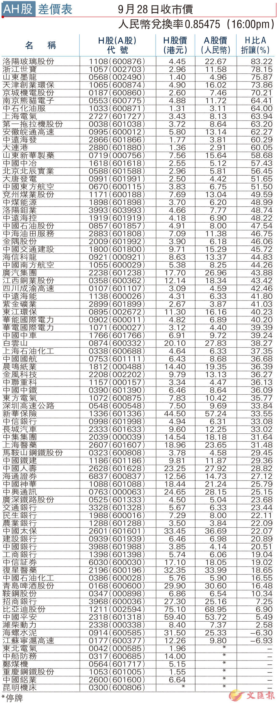 AH股差價表