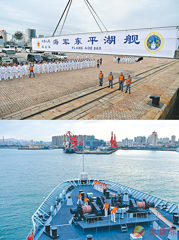 海軍「東平湖艦」昨日靠港。當日,中國海軍艦艇編隊完成中俄「海上聯合-2017」第二階段軍事演習任務,順利返回山東青島某軍港。據了解,此次中方參演艦艇編隊由導彈驅逐艦「石家莊艦」、導彈護衛艦「大慶艦」、綜合補給艦「東平湖艦」和援潛救生船「長島船」組成。編隊9月13日啟航,先後航經黃海、東海、日本海、鄂霍次克海、西北太平洋等海域,穿越對馬、宗谷等海峽,總航程近5,000海里。 ■中新社