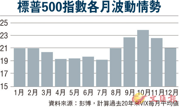 根據FactSet估計,標普500指數成份股盈利表現預計明年將增長11%,指數明年有機會出現10%的漲幅,股市成長性仍存。但機構投資者提醒,若是計算過去20年來、反映標普500指數期貨波動程度的「恐慌指數」(VIX)每月平均值,十月是市場波動較大的時刻,建議看好美股增長性的投資者,不妨以多元配置概念基金進一步參與行情。