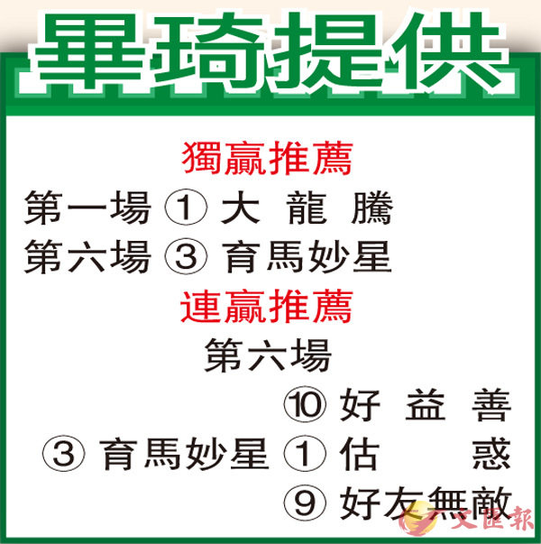 「大龍騰」助手彭福公園踱一圈,扣住韁約束沿近欄輕鬆操踱,伸長馬頸扯韁越行越有氣勢,步大力雄,身茁壯毛色泛現光采,狀態更上層樓。