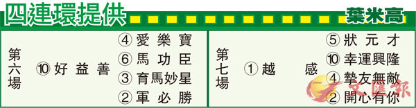 第六場、第三班、一二○○米。「好益善」今季首戰配雷神交出不俗走勢,所負僅個半馬位跑第六;省完一場後,剛仗換上蔡明紹執韁,閘前瘋狂落飛至七倍開跑,雖然因應排十檔而留得較後,但直路上亦交出全場最快末段時間追獲亞軍,能夠力迫「愛樂寶」,反映本身評分有利,而且狀態已提升至爭勝水平。「好益善」此系馬屬沈廄重要支持者之一,相信馬房對於此駒的爭勝機會都十分緊張,而且值得留意一點,此駒上季初曾經連續兩仗上名,反映雖然剛戰打完硬仗,但體力方面應該可以頂多一鋪,現將出擊箭頭鎖定在今仗,擺明車馬爭出頭。