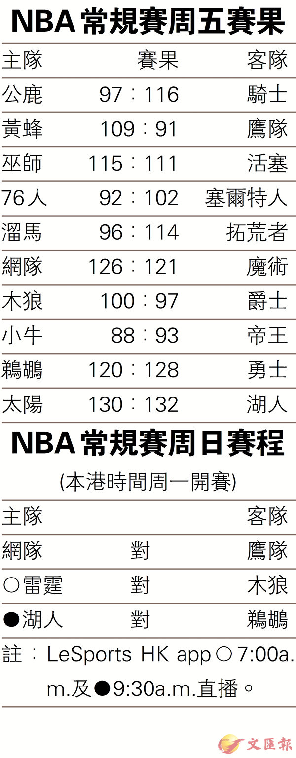 NBA常規賽周五賽果