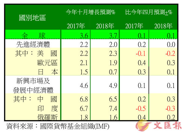 據國際貨幣基金組織(IMF)最新發佈的「世界經濟展望」報告,2017年、2018年全球經濟增長預測分別為3.6%、3.7%與四月預測相比均調升0.1%。