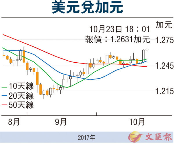 美元兌加元上周四持穩1.2450附近支持位後逐漸反彈,上周尾段重上1.26水平,本周初曾走高至1.2640附近7周多高位。日本執政聯盟勝出眾議院選舉,首相安倍晉三連任,黑田東彥有望續任日本央行行長之職,消息引致日圓走勢偏弱,美元兌日圓一度攀升至114.10附近3個多月高位,同時加泰羅尼亞自治區將被西班牙中央政府接管的消息令歐元本周初走勢偏弱,均有助美元走勢偏強,並帶動美元兌加元在1.26水平進行整固。