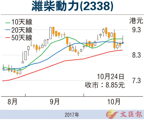 濰柴業績理想,多間大行也紛紛加入唱好行業,其中摩通便將其目標價由9.3元(港元,下同)上調至10.7元,評級「增持」。濰柴預測市盈率約14倍,市賬率2.01倍,估值合理,在股價逆市有勢下,料後市有力再試近期高位的9.5元。