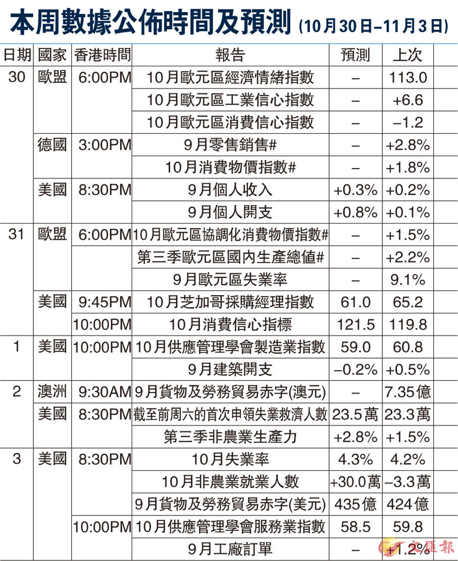 本周數據公佈時間及預測 (10月30日-11月3日)