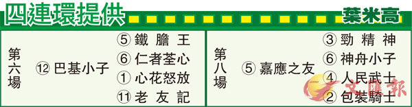 第六場、第三班、一二○○米。明星馬「巴基之星」現時需要多次試閘合格才可上陣,幕後目前想拉頭馬的話,只好寄望同主馬「巴基小子」,事實上,此駒雖然已屆七歲之齡,但告東尼上季尾開始將此駒專攻泥地千二米,跨季六戰取得二至五名各一,雖然上仗大敗而回,但翻睇賽事片段可以發現,此駒出閘後不久被他駒撞至失去平衡,可能因此同時失去角逐興趣,敗績不宜放大,今仗續跑此程,只要發揮出應有水準,隨時露出真面目,不妨冷敲。