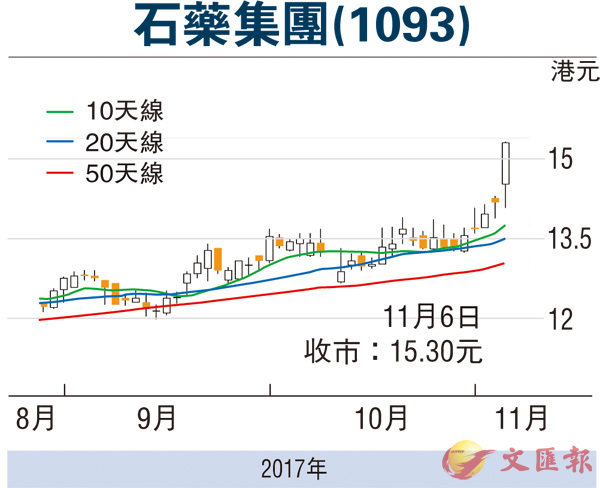 石藥升勢悅目,除了月中(15日)將派發的第三季成績表備受憧憬外,集團日前公佈兩項藥物獲發臨床研究批件,也成為股價得以脫穎而出的藉口。據石藥的通告顯示,集團開發的1.1類化學藥品「HA121-28」及2.2類化學藥品「注射用前列地爾脂質體」臨床前研究資料已通過國家食品藥品監督管理總局藥品審評中心技術審評,近日獲國家藥監局頒發臨床研究批件。