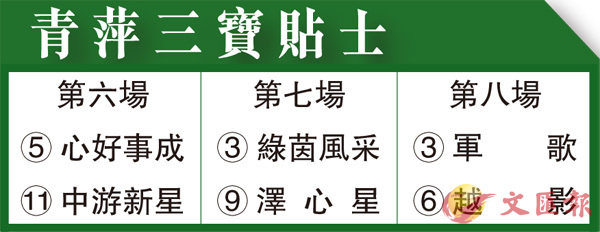 第六場、第三班、一六五○米。「心好事成」迄今錄得兩冠兩亞三季,腳患馬自上季轉投鄭廄後已可勤跑乃佳兆,再看季初評八十一分已先後三戰無功,不過上賽谷草一哩排劣位之下,七十三倍大冷拉士爆一段只負頭馬兩身位,足證其健康情況已復元八九;今次練者再攻此程改配郭能上陣,當有出冷之力。