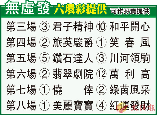第八場、第三班、一六五○米。「美麗寶寶」曾經四捷田草賽事,級數靠得住,今季多跑之下狀態漸入佳境,其中近兩仗移師谷草取得一亞一殿,捲土重來可贏馬交代。「紅運發財」三歲仔尚有好大進步空間,近兩仗在同程取得一冠一季,目前剛踏上升軌,有力乘勝追擊。