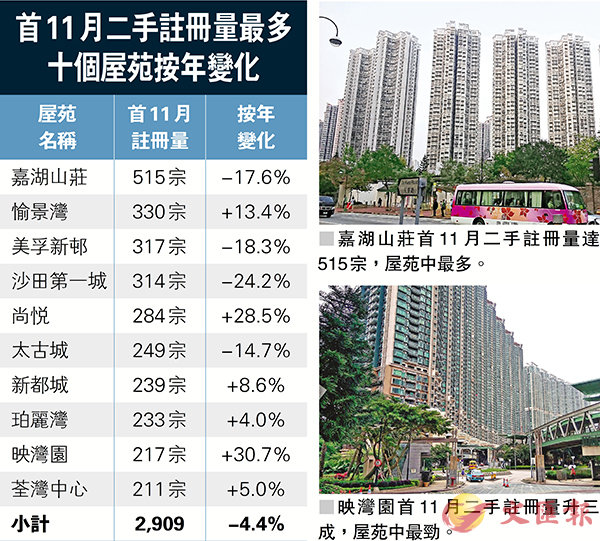若以年內首11個月二手註冊量最多的十個屋苑計算,共錄2,909宗註冊登記,較去年全年少約4.4%;當中沙田第一城差幅最大,暫錄314宗,仍少約24.2%。美孚新h、嘉湖山莊及太古城亦較去年全年少約14.7%至18.3%;反之,映灣園今年首11個月已錄217宗,比起去年全年高出約30.7%,而尚悅亦高出約28.5%,另愉景灣、新都城、荃灣中心及珀麗灣均已超去年總數。