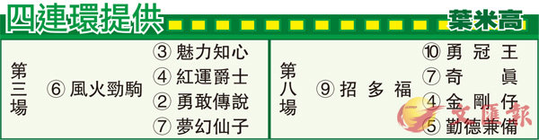 第八場、第三班、一六五○米。「招多福」幕後近年全力支持苗禮德,而此駒雖然在港首兩季僅贏一場,但北半球馬需時適應水土以及較遲熟,所以成績可以接受,而且此駒今季表現相當穩定,季內三戰取得一冠兩亞,最難得係一如上季首戰贏馬,而且近兩仗回升三班面對更強對手,仍然一再跑獲亞軍,確認在此班仍然有惡氣,此類剛開始踏上升軌之馬,在苗禮德手上必定用盡再算,所以鬥志一層毋須懷疑,而且值得留意一點,就係此駒季內三戰,所造末段時間均屬全場最快,可見現居三班負磅不重,其實相當有利,今次繼續安排在首本路程谷草一哩列陣,路合態勇必有決心補中。