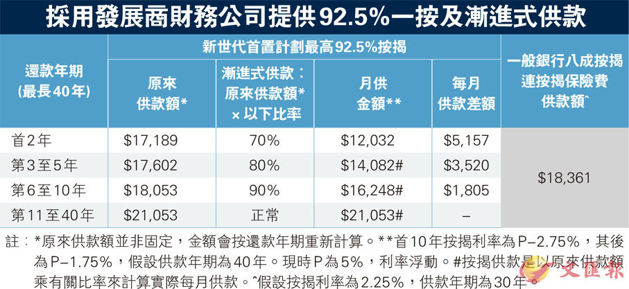 採用發展商財務公司提供92.5%一按及漸進式供款