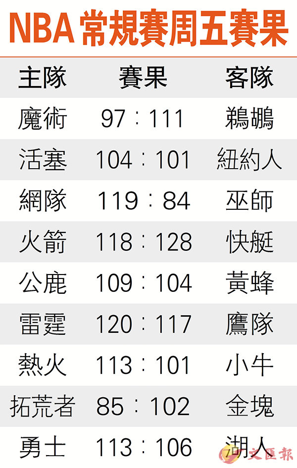 NBA常規賽周五賽果